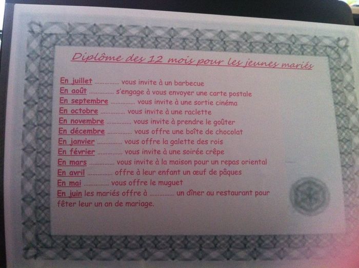 Et voilà j'ai fais mes diplômes pour le jour J!! Ca m'a pris du temps je suis pas une gande fortiche sur l'ordinateur. Je vous mets le modèle pour les mariés et un mois en modèle.