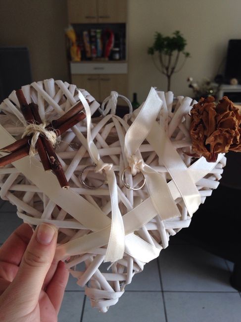 Bonjour à toute et atous! Hier nous sommes allé commander nos alliances du coup aujourd hui j ai fais mon porte alliance maison vous en pensez quoi? Notre thème c est champêtre. La rose fanée à gauche et et le cœur est très important pour nous car...