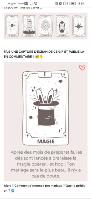 Coucou tout le monde 💜 Merci d'avoir participé jusqu'au bout ! Maintenant qu'on en sait un peu plus sur ton mariage, on va pouvoir tirer les cartes... FAIS UNE CAPTURE D'ÉCRAN DE CE GIF ET PUBLIE LA EN COMMENTAIRE !! 🧐👇 Alors ? Comment s'annonce ton...