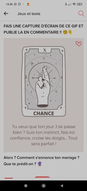 Coucou tout le monde 💜 Merci d'avoir participé jusqu'au bout ! Maintenant qu'on en sait un peu plus sur ton mariage, on va pouvoir tirer les cartes... FAIS UNE CAPTURE D'ÉCRAN DE CE GIF ET PUBLIE LA EN COMMENTAIRE !! 🧐👇 Alors ? Comment s'annonce ton...