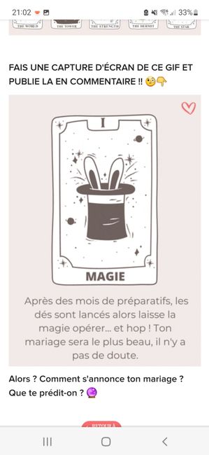 Coucou tout le monde 💜 Merci d'avoir participé jusqu'au bout ! Maintenant qu'on en sait un peu plus sur ton mariage, on va pouvoir tirer les cartes... FAIS UNE CAPTURE D'ÉCRAN DE CE GIF ET PUBLIE LA EN COMMENTAIRE !! 🧐👇 Alors ? Comment s'annonce ton...