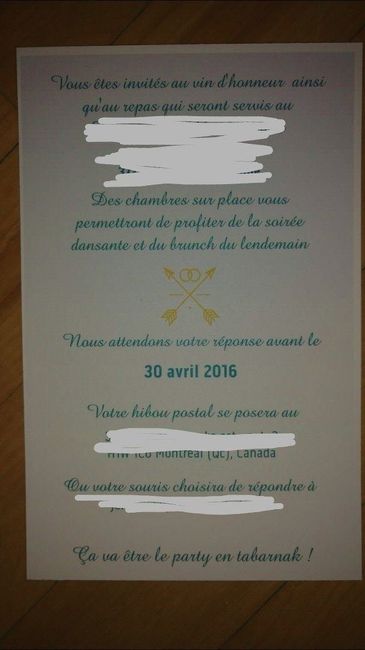 Nos faire-part commandés sur Vistaprint sont enfin arrivés, avec 2 jours d'avance on est super contents du résultat !!! Pour 123$ CAD (87Euros) nous avons eu 120 invitations, presque autant de coupons réponses et les enveloppes. Le résultat nous...