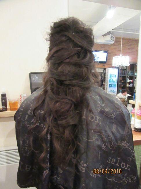 ... Après mes essais coiffures! J'ai les cheveux fins et plats et la coiffeuse m'a fait une tresse signe de Raiponce ,j'ai de tous petits yeux et cette fois j'ai eu un maquillage qui me les agrandis ! Dommage de ne pas avoir eu les deux le même jour...