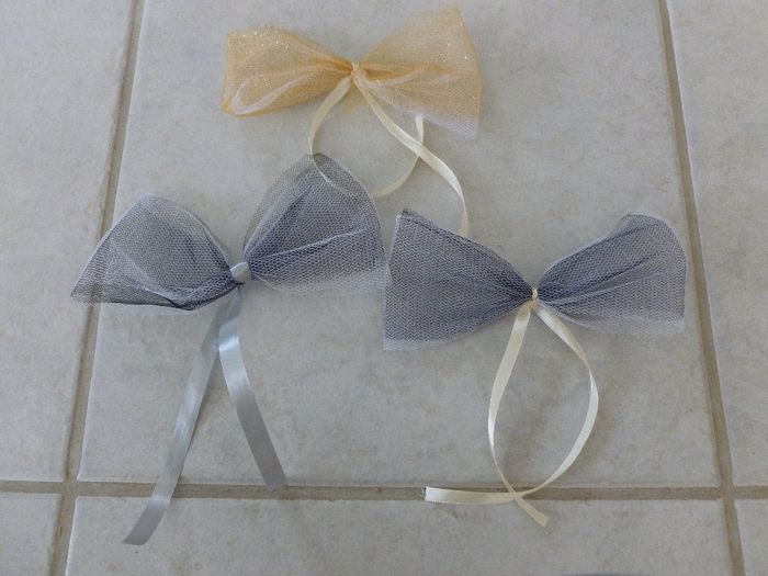 Hello tout le monde et voilà mes 200 noeuds sont finis Merci aux personnes qui m'ont donné des idées pour l'achat du tulle dans un post precedent. Pour le lien j'ai utilisé soit du bolduc non brillant soit du satin gris ou ivoire Pour le tulle...