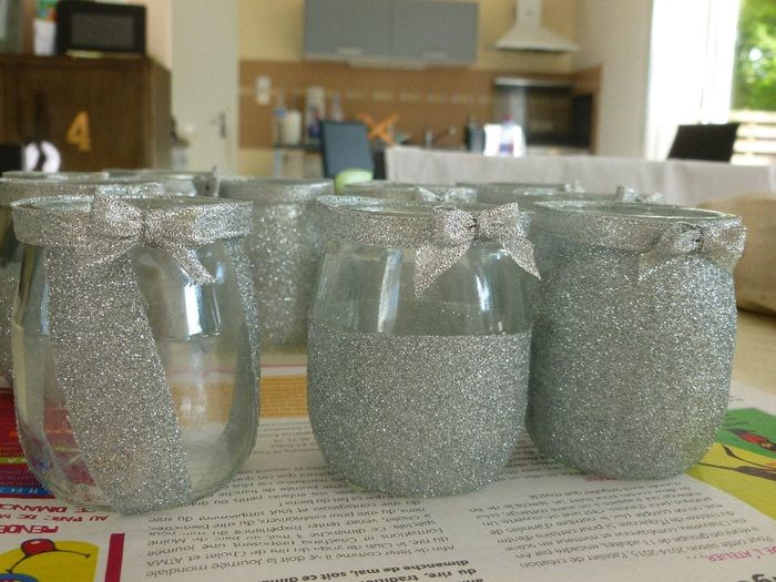 Coucou tout le monde Enfin mes 15 pots "Or" sont finis bon j'ai encore les argents à faire............ Il m'a fallu environ 5 jours (je suis pas rapide lol) mais entre la mise en place du scotch, le collage, les paillettes, le sechage, le...