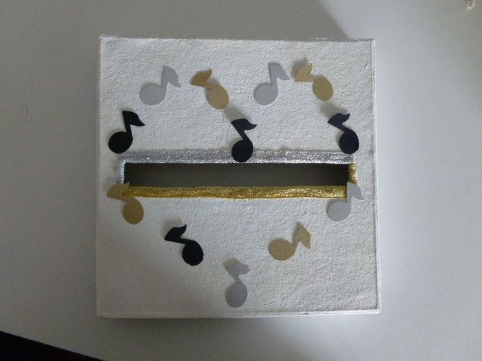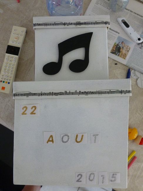 Coucou J'ai fait des essais pour la decoration du dessus de mon urne. Quand pensez vous? que preferez vous? Coeur dessus urne avec notes mélangées bonne journée