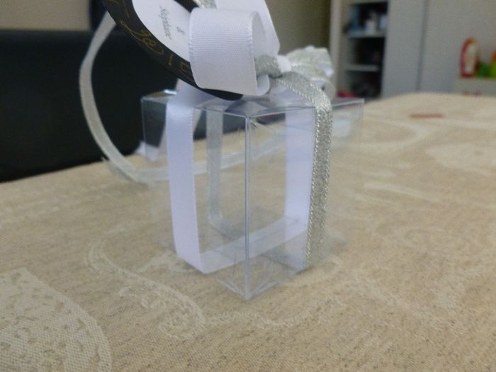 après avoir passé un certain nombre d'heures à monter mes contenants de dragées...., les boites avaient un film protecteur et il a fallu les pliées) j'ai fait un esais pour les rubans et les etiquettes: pour les etiquettes l'idée est de s'inspirer...