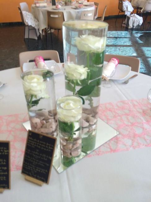Coucou les filles!!!! Juste pour vous montrer les centres de table que l'on aura le jour du mariage. La seule chose qui sera différente, c'est que ça ne sera pas des cailloux gris mais des cailloux violets dans les trois vases. On ne voit pas bien...