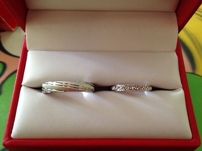 Voilà nos alliances, on a fait un seul magasin (Maty) pas facil de trouver la bague que l'on va mettre toute ca vie ! Si vous voulez mettre la photo de vos bagues a vous aussi cela pourrait être sympa ! Bisous a toutes et tous !