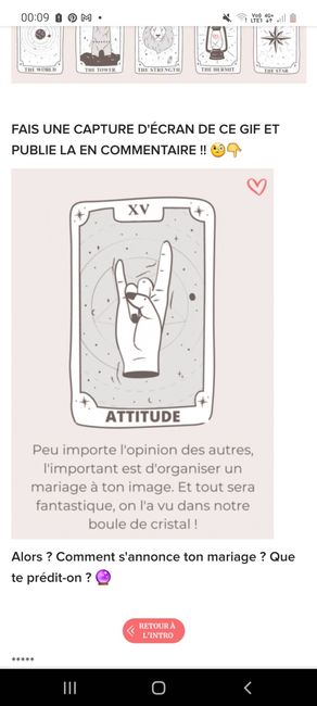 Coucou tout le monde 💜 Merci d'avoir participé jusqu'au bout ! Maintenant qu'on en sait un peu plus sur ton mariage, on va pouvoir tirer les cartes... FAIS UNE CAPTURE D'ÉCRAN DE CE GIF ET PUBLIE LA EN COMMENTAIRE !! 🧐👇 Alors ? Comment s'annonce ton...