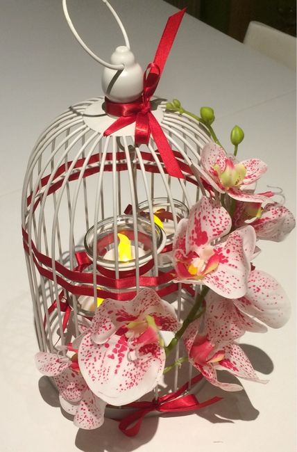 Petite Perso de notre cage à oiseau acheter 8EUR chez tati avec une orchidee artificiel 11EUR chez Truffaut et du ruban Le tout sur notre thème rouge et blanc