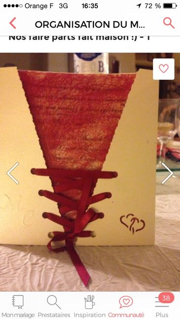 Voici nos faire parts fait maison! Nous avons glisser les invitations derrière le papier de soie Bordeau!! Nos coleures sont ivoire et Bordeau et ma robe un lacet ( pas bordeau par contre ) et nos initiales en relief sur le côté ( M&C ) Trop hate...