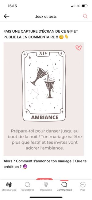 Coucou tout le monde 💜 Merci d'avoir participé jusqu'au bout ! Maintenant qu'on en sait un peu plus sur ton mariage, on va pouvoir tirer les cartes... FAIS UNE CAPTURE D'ÉCRAN DE CE GIF ET PUBLIE LA EN COMMENTAIRE !! 🧐👇 Alors ? Comment s'annonce ton...
