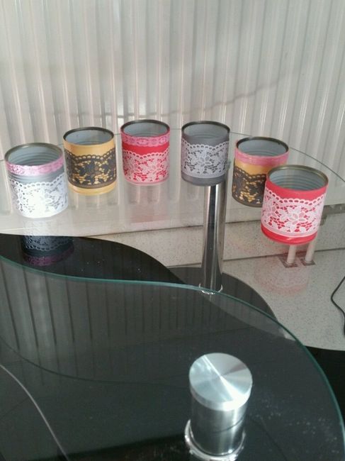 Salut les filles . Ce soir j'ai fait quelques petites créations pour mes tables. Donnez moi vos avis et idées sachant que mon thème est romantique avec comme couleur ivoire, vieux rose et gris. Les pots en verre serviront de photophore et les boîtes...