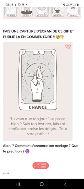Coucou tout le monde 💜 Merci d'avoir participé jusqu'au bout ! Maintenant qu'on en sait un peu plus sur ton mariage, on va pouvoir tirer les cartes... FAIS UNE CAPTURE D'ÉCRAN DE CE GIF ET PUBLIE LA EN COMMENTAIRE !! 🧐👇 Alors ? Comment s'annonce ton...