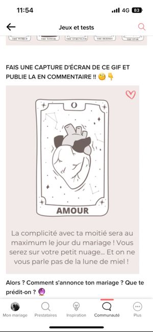 Coucou tout le monde 💜 Merci d'avoir participé jusqu'au bout ! Maintenant qu'on en sait un peu plus sur ton mariage, on va pouvoir tirer les cartes... FAIS UNE CAPTURE D'ÉCRAN DE CE GIF ET PUBLIE LA EN COMMENTAIRE !! 🧐👇 Alors ? Comment s'annonce ton...