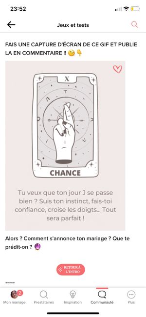 Coucou tout le monde 💜 Merci d'avoir participé jusqu'au bout ! Maintenant qu'on en sait un peu plus sur ton mariage, on va pouvoir tirer les cartes... FAIS UNE CAPTURE D'ÉCRAN DE CE GIF ET PUBLIE LA EN COMMENTAIRE !! 🧐👇 Alors ? Comment s'annonce ton...