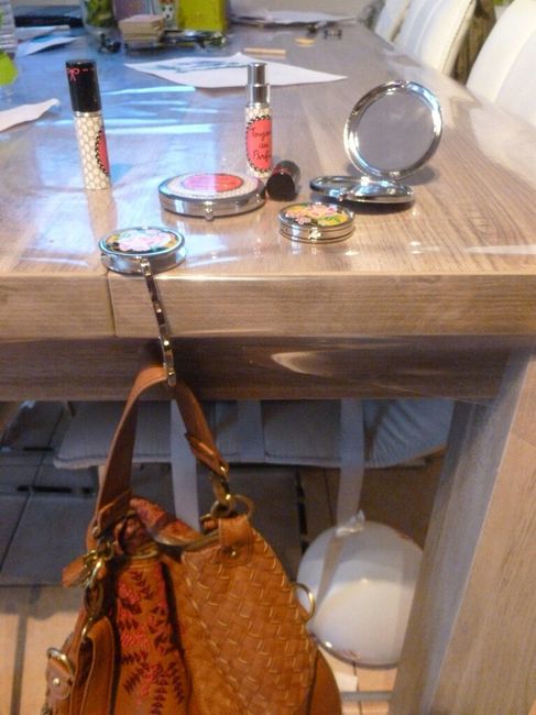 Voilà j ai enfin trouvé mes petits cadeaux témoins Un accroche sac, un vaporisateur pour mettre leur parfum et un petit miroirQu' en pensez vous???