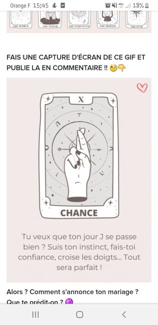 Coucou tout le monde 💜 Merci d'avoir participé jusqu'au bout ! Maintenant qu'on en sait un peu plus sur ton mariage, on va pouvoir tirer les cartes... FAIS UNE CAPTURE D'ÉCRAN DE CE GIF ET PUBLIE LA EN COMMENTAIRE !! 🧐👇 Alors ? Comment s'annonce ton...