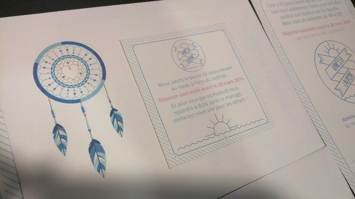 Réalisé entièrement par Mr Meenoo, graphiste et motion designer de profession qui a designé sa pièce maitresse, le dreamcatcher avec amour. Alors vos avis les filles??? Face du faire-part Sticker Envellope et carton repas Dos du faire-part ...