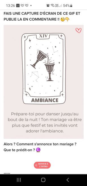 Coucou tout le monde 💜 Merci d'avoir participé jusqu'au bout ! Maintenant qu'on en sait un peu plus sur ton mariage, on va pouvoir tirer les cartes... FAIS UNE CAPTURE D'ÉCRAN DE CE GIF ET PUBLIE LA EN COMMENTAIRE !! 🧐👇 Alors ? Comment s'annonce ton...