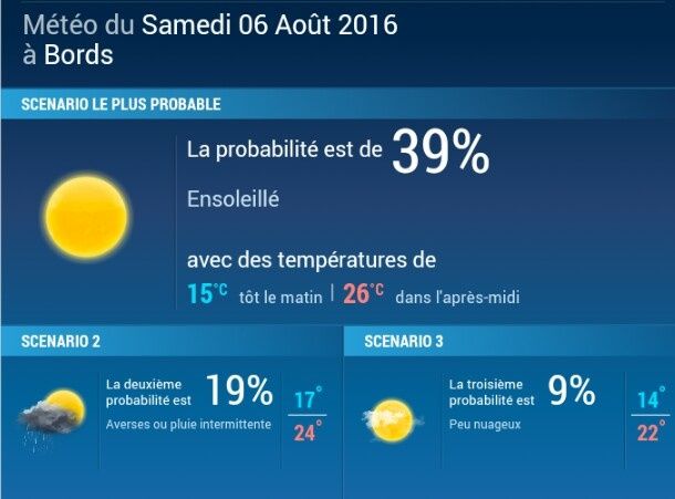Qui a eu le courage de regarder la météo à 365 jours (même si on y croit pas)? Ça. Donne 3 estimations de ce que pourrait être la météo le jour du mariage! Allez voilà le lien http://www.lachainemeteo.com/previsions-meteo-a-365-jours.php
