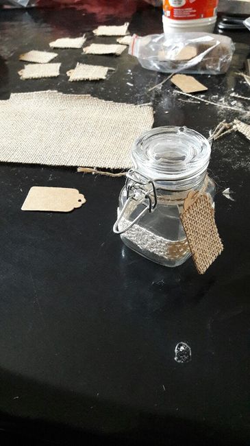 Cc a ttes et à tous Aujourd'hui journée diy et jeu de patience lol je m amuse à découper ma toile de jute et la coller sur ma petite étiquette qui va sur mes contenants à dragées. Sur mes petites étiquettes sera écrit des petits mots du côté de la...