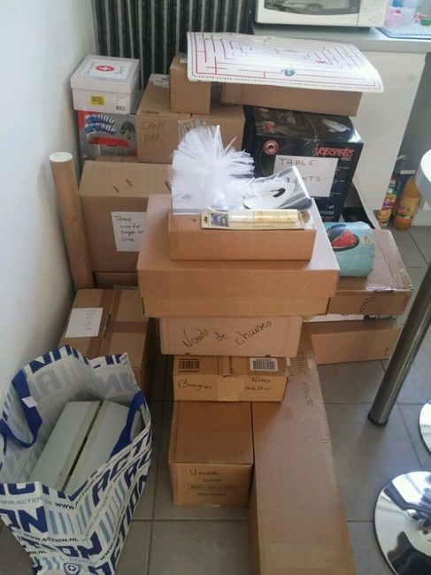 Un carton photobooth et arbre à empreintes, un carton «enfants», un carton bougies extérieures et un avec les pots pour la fleuriste. J'ai acheté beaucoup de trucs pour les enfants en fait!!! Tout ça plus mon décor photobooth en origami, le tabouret...