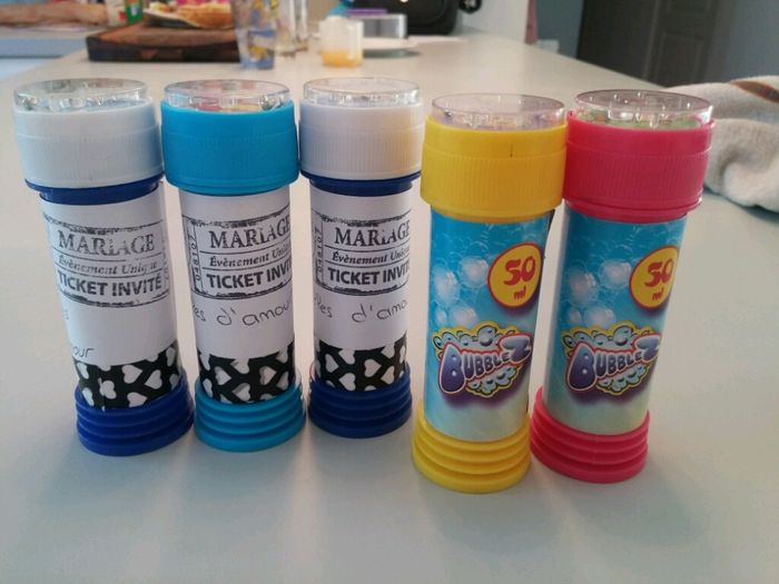 Coucou, niveau déco je n'ai que mon plan de table à imprimer, j'ai voulu faire du rangement et en prenant mes tubes pour bulles pour les enfants sortie de mairie, j'ai vu que ca se décollait. Je n'avais pas prévue de les décorer mais bon...pour les...