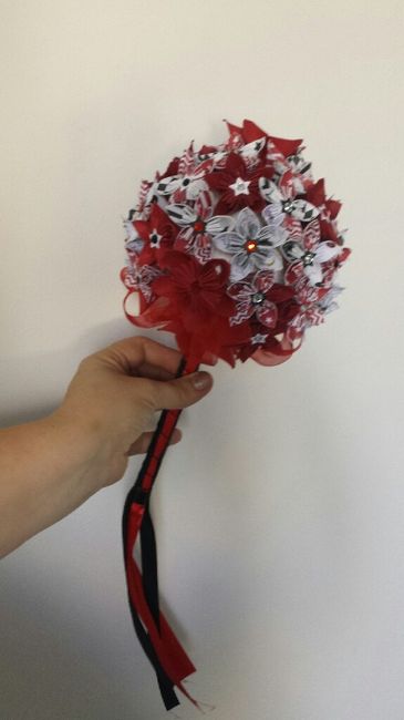 Bouquet du vendredi enfin fini.Le vendredi on fait la mairie avec les couleurs de deadpool et les invités déguisé en super héros. Voilà mon bouquet. Et le samedi C est la cérémonie avec une thématique gros jaune blanc et des accessoires de super...
