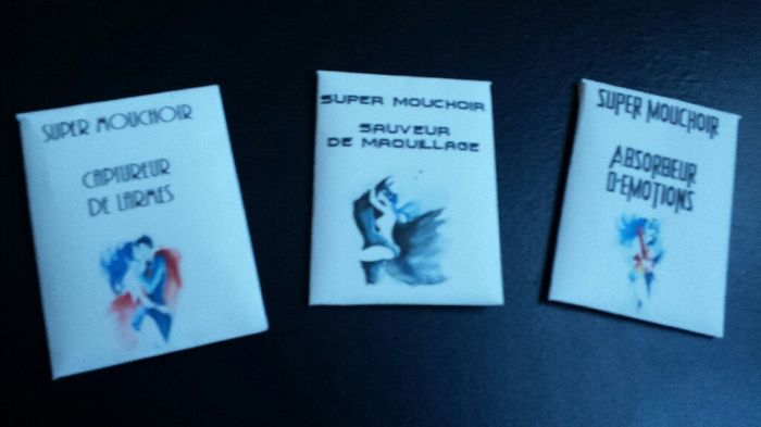 Et voilà nos super mouchoirs pour les larmes de joie.Il y aura également une mini boite avec avec 3 mouchoirs pour monsieur et ses témoins et une maxi boîte pour moi et mes témoins avec beaucoup de mouchoir. Prochaines étapes la création d accessoire...