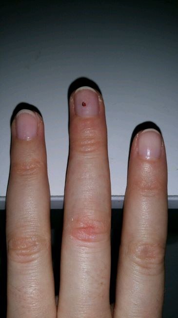 A vous qui avez suivi ma désastre aventure d'hier de mon doigt tout bleuté et bien douloureux.... Et bien aujourd'hui voilà mon ongle troué après mon passage hier aprem à la clinique SOS mains. La douleur est quasi partie donc ça c top ! Et ce sera...
