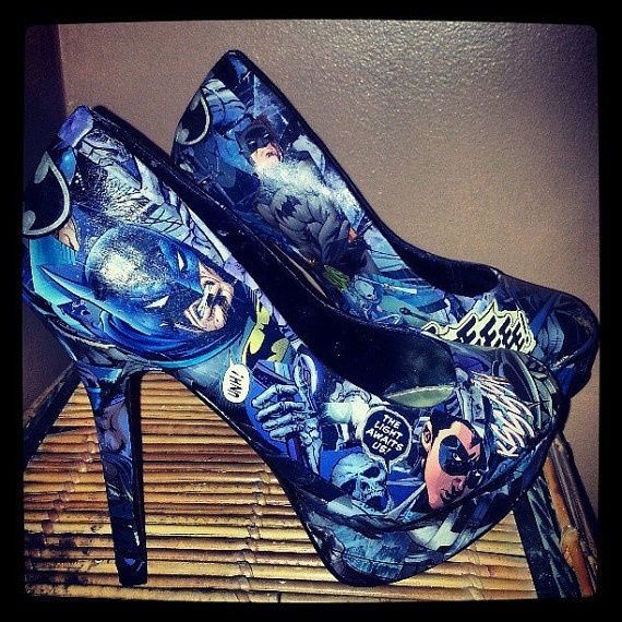 bonsoir! J'ai besoin de votre avis! J'hésite entre deux paires de chaussures! Ayant une robe classique j'aimerais des chaussures de couleur mais j'en ai repérées des en couleur décalées (nous sommes tous les deux fans de batman). J'ai peur d'en faire...