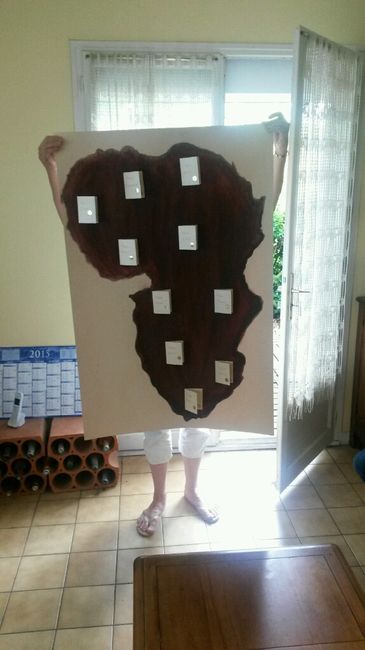 Coucou les futurs !! Voici mon plan de table presque fini !!! (il me manque juste une table à coller en haut à droite !) Sur le thème Europe Afrique, avec les noms de tables qui sont des fruits européens et africains ! L me fond a été réalisé par une...
