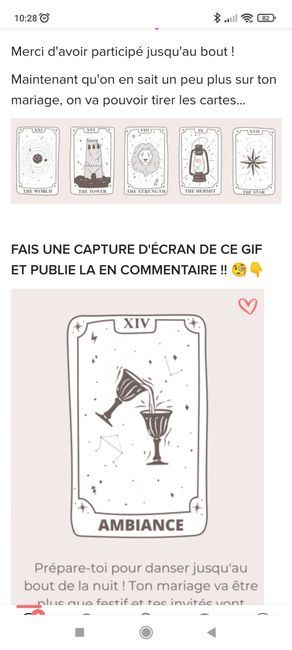 Coucou tout le monde 💜 Merci d'avoir participé jusqu'au bout ! Maintenant qu'on en sait un peu plus sur ton mariage, on va pouvoir tirer les cartes... FAIS UNE CAPTURE D'ÉCRAN DE CE GIF ET PUBLIE LA EN COMMENTAIRE !! 🧐👇 Alors ? Comment s'annonce ton...
