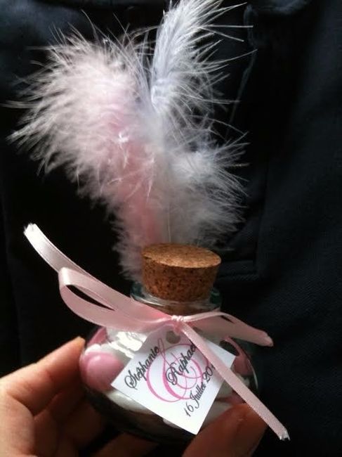 coucou les mariées Voici mes cadeaux invités par couple, ce sont des fioles de chez Ca*a, à 1 € pièce, les plumes j'ai acheté en Allemagne dans un magasin de brico, et les roses en France à Espace petits pri* ! (5 € le total mais je doit en avoir...