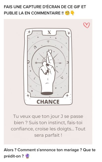 Coucou tout le monde 💜 Merci d'avoir participé jusqu'au bout ! Maintenant qu'on en sait un peu plus sur ton mariage, on va pouvoir tirer les cartes... FAIS UNE CAPTURE D'ÉCRAN DE CE GIF ET PUBLIE LA EN COMMENTAIRE !! 🧐👇 Alors ? Comment s'annonce ton...