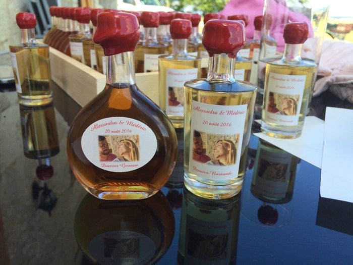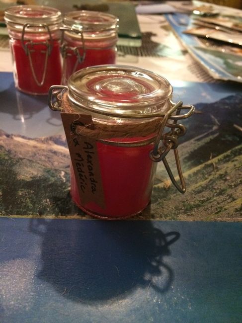 Salut les filles, voilà nos cadeaux invités 100% fait main . Pour les femmes bougies odeur fleur des îles couleurs rose - rouge ( pas facile d'avoir un resultat parfait on est pas des pro) et les hommes mignonnettes armagnac ou de calvas ( moi de...