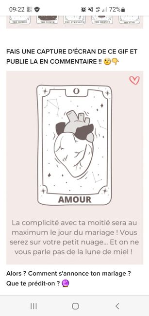 Coucou tout le monde 💜 Merci d'avoir participé jusqu'au bout ! Maintenant qu'on en sait un peu plus sur ton mariage, on va pouvoir tirer les cartes... FAIS UNE CAPTURE D'ÉCRAN DE CE GIF ET PUBLIE LA EN COMMENTAIRE !! 🧐👇 Alors ? Comment s'annonce ton...