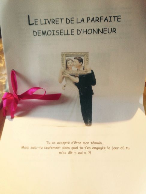 Voici le kit témoins que j ai fais pour elle ... Il y a plein de produit de beauté dans la boîte : vernis, gel douche, deo, gloss, pour le bain, ... Et plein de gaget en rapport au mariage : éponge pour laver la voiture, daphalgan pour mal de tête,...