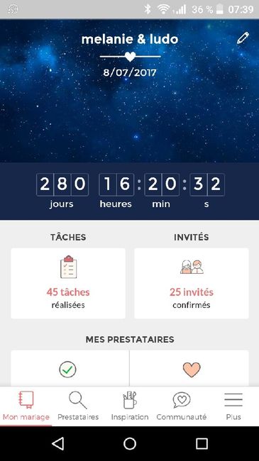 Je me suis inscrite sur ce site Ă plus de 900 jours de mon jour J et lĂ on est plus qu'Ă 280. C'est passĂ© super vite. Et voici oĂč j'en suis dans mes prĂ©paratifs alle, traiteur, dj, photographe, fleuriste okRobe costume ok en recherche de chaussures...