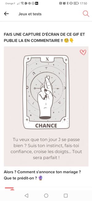 Coucou tout le monde 💜 Merci d'avoir participé jusqu'au bout ! Maintenant qu'on en sait un peu plus sur ton mariage, on va pouvoir tirer les cartes... FAIS UNE CAPTURE D'ÉCRAN DE CE GIF ET PUBLIE LA EN COMMENTAIRE !! 🧐👇 Alors ? Comment s'annonce ton...
