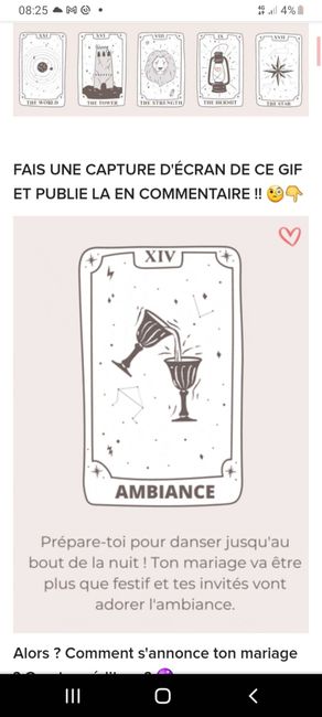 Coucou tout le monde 💜 Merci d'avoir participé jusqu'au bout ! Maintenant qu'on en sait un peu plus sur ton mariage, on va pouvoir tirer les cartes... FAIS UNE CAPTURE D'ÉCRAN DE CE GIF ET PUBLIE LA EN COMMENTAIRE !! 🧐👇 Alors ? Comment s'annonce ton...