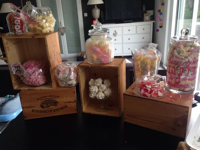Voila samedi c'est le day d je commence à déballer les paquets de bonbecs ... Toute cette deco sera sur une table en bois avec une nappe dentelle chiné dans un vide Grenier et je mettrais sûrement une guirlande lumineuse entre les caisses ... Miam...