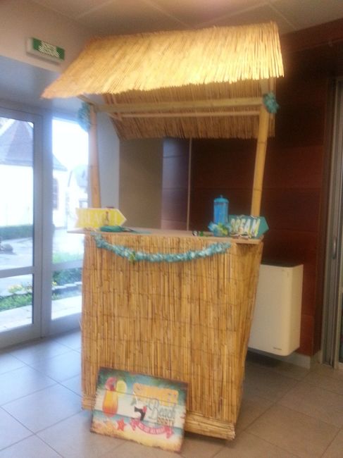 En plus d'un Candy Bar, j'ai eu l'idée un peu sogrenue, d'un Tikki bar... Et oui, avec un thème Ile lointaines, je me voyais au bord de l'eau avec un petit cocktail Ni une ni deux j'ai demandé à Monsieur qui est un peu bricolo de me créer ça...il...