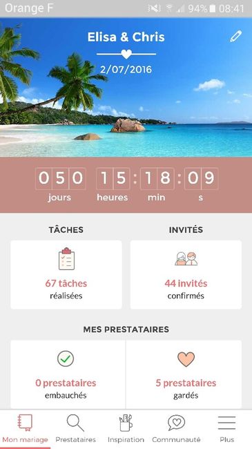 Coucou Voici mon compteur à 50j, j'ai l'impression que je n'y arriverai jamais à organiser. J'ai déjà eu quelques aventures entre la mairie qui voulait pas me donner le dossier et inscrire, maintenant c'est fait les bans sont publiés. Rdv au 18 juin....