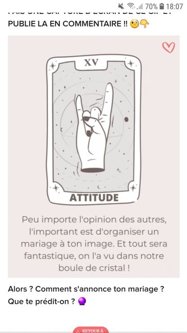 Coucou tout le monde 💜 Merci d'avoir participé jusqu'au bout ! Maintenant qu'on en sait un peu plus sur ton mariage, on va pouvoir tirer les cartes... FAIS UNE CAPTURE D'ÉCRAN DE CE GIF ET PUBLIE LA EN COMMENTAIRE !! 🧐👇 Alors ? Comment s'annonce ton...