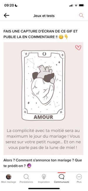 Coucou tout le monde 💜 Merci d'avoir participé jusqu'au bout ! Maintenant qu'on en sait un peu plus sur ton mariage, on va pouvoir tirer les cartes... FAIS UNE CAPTURE D'ÉCRAN DE CE GIF ET PUBLIE LA EN COMMENTAIRE !! 🧐👇 Alors ? Comment s'annonce ton...