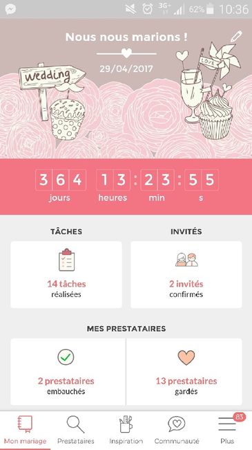J-365 ! Ca y est le compte à rebours à commencé, on va désormais compter en mois !! Petit message adorable de mes témoins hier soir et ce matin Vous en êtes ou de vos préparatifs ? Nous on a la salle le photographe le traiteur la vaisselle....