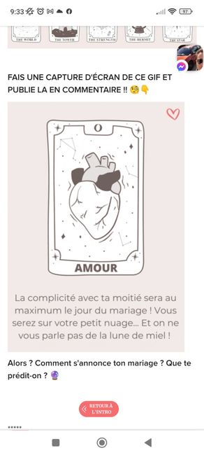 Coucou tout le monde 💜 Merci d'avoir participé jusqu'au bout ! Maintenant qu'on en sait un peu plus sur ton mariage, on va pouvoir tirer les cartes... FAIS UNE CAPTURE D'ÉCRAN DE CE GIF ET PUBLIE LA EN COMMENTAIRE !! 🧐👇 Alors ? Comment s'annonce ton...